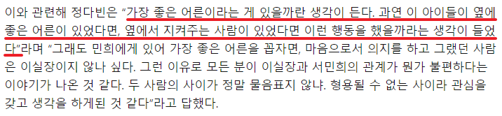 사실 저는 왕철과 민희의 관계에 대해서는 불편한 적이 없었기 때문에, 정다빈이 한 얘기를 소개하고 싶지는 않았는데, 정다빈이 밝힌 내용 중에 제 생각과 일치하는 부분이 있어서 소개해 드리고 싶었어요. 이 부분입니다. "가장 좋은 어른이라는 게 있을까란 생각이 든다. 과연 이 아이들이 좋은 어른이 있었다면, 옆에서 지켜주는 사람이 있었다면 이런 행동을 했을까라는 생각이 들었다. 가장 좋은 어른을 꼽자면 이실장이 않나 싶다." 만약 저에게 이 드라마의 주제를 30자로 나타내라고 한다면 정다빈이 말한 이 내용을 꼽고 싶을 정도로 제 생각과 정확히 일치하는 것 같아요. 사실 정다빈에게는 조금 불편한 감정이 있었습니다. 정다빈 잘 못은 아니겠지만 박주현이 두 번짼데, 계속 정다빈이 두번째로 소개되어서요. 근데 이런 생각을 갖고 있는 걸 봤으니까 이제 불편한 마음은 걷을게요. 정다빈도 화이팅~~!!