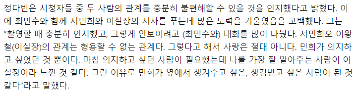 자, 이제 정다빈이 밝힌 내용을 한 번 볼게요. '촬영할 때부터 왕철과의 관계를 시청자들이 불편해할 것을 예상했다.' '설명하기 어려운 관계지만, 사랑은 절대 아니다. 의지하고 싶고, 나를 잘 알아주는 사람이라고 느낀 것 같다'라고 했습니다. 지난 영상에서 이 드라마의 성공 요인은 전형적인 틀로는 설명이 어렵다는 데 있다고 얘기했었죠. 왕철과 민희도 역시 설명이 쉽지 않은 관계가 맞네요.