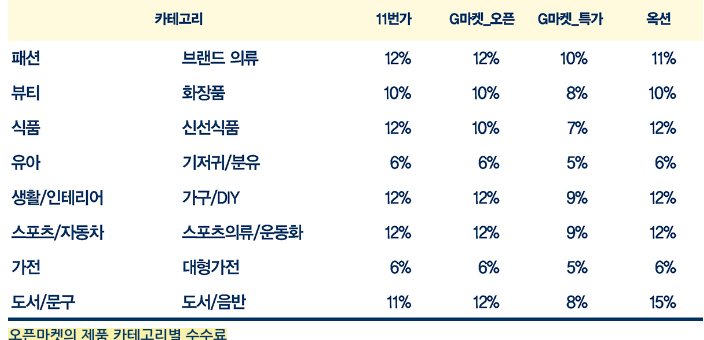 - 오픈 마켓의 판매 수수료는 8~12%. 상품 카테고리에 따라 수수료가 다르다