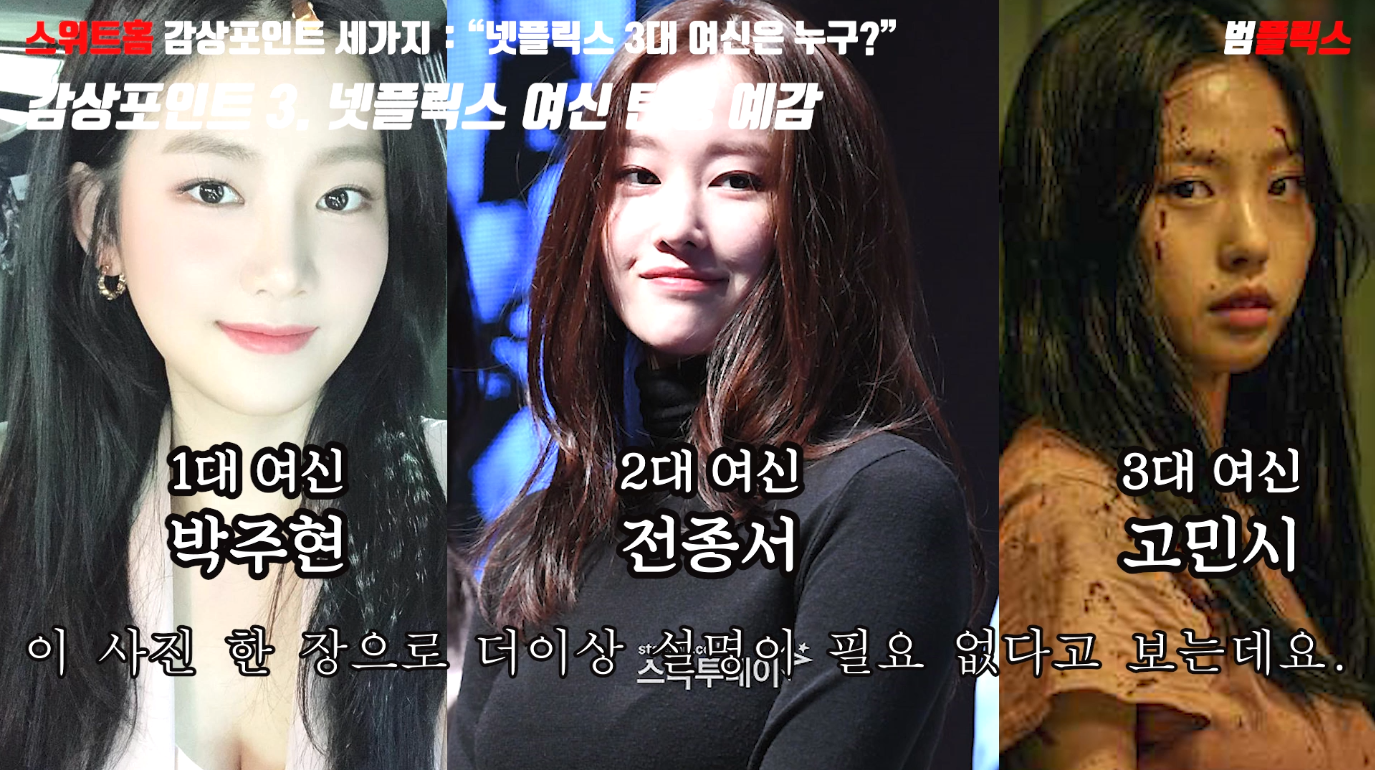 자, 그럼 3대 여신은 누가 될 것이냐? 다른 얘기부터 먼저 잠깐 하고, 범플릭스가 예감하는 3대 넷플릭스 여신을 공개하겠습니다.