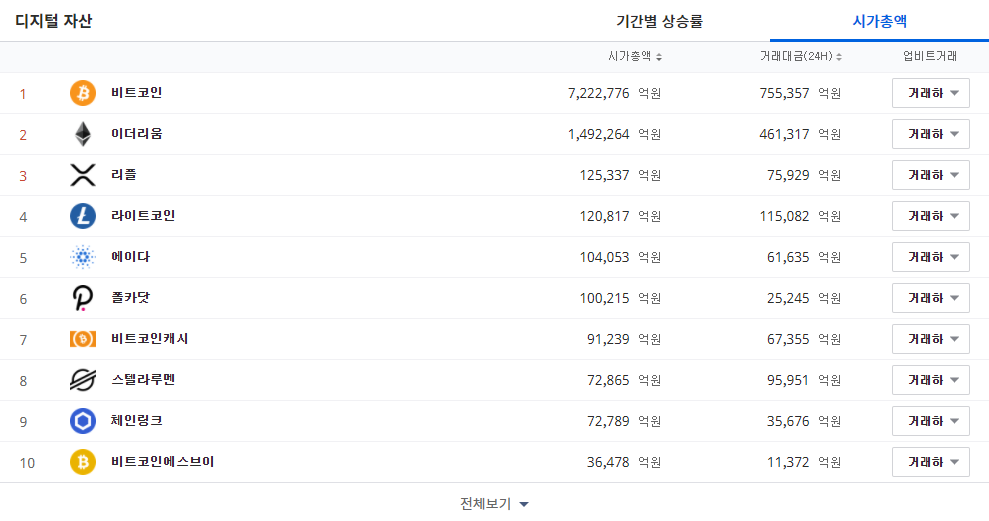 디지털 자산 섹션에서는 각 기간별로 상승률 순으로 Sorting 할 수도 있고, 시가총액 순위를 볼 수도 있습니다.