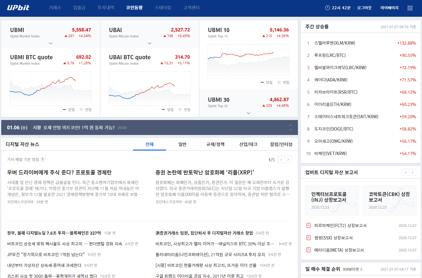 업비트 홈 화면에서 '코인동향'에 들어가 보시면, 업비트에서 제공하는 Market Index, 상승률 상위 종목, 시가총액 상위 종목, 디지털 자산 보고서, 뉴스등을 확인하실 수 있습니다.