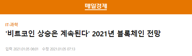 매일경제, 1월 5일자 <'비트코인 상승은 계속된다' 2021년 블록체인 전망>입니다. 필자는 서두에 일부 상상력을 가미했다고 얘기 하지만, 상당히 일리 있는 인사이트라고 생각합니다. 한 번 들어보시죠.