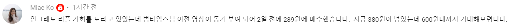 리플 노리고 있다가, 제 영상보고 용기내서 289원에 매수했더니 많이 올랐다고 '미애 고'님께서 댓글을 주셨는데요. 제가 다 기분이 좋네요. 더 많은 분들이 좋은 기회 잡으셨길 바랍니다.