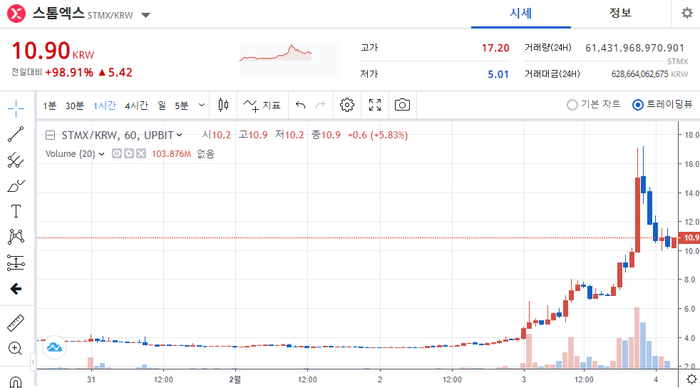 그리고 스톰엑스 차트입니다. 역시 급등했다가 떨어지는 시점에 매수를 결정했습니다. 역시 이 지점을 상향 돌파할 때 바로 사면 되겠다고 생각했습니다.