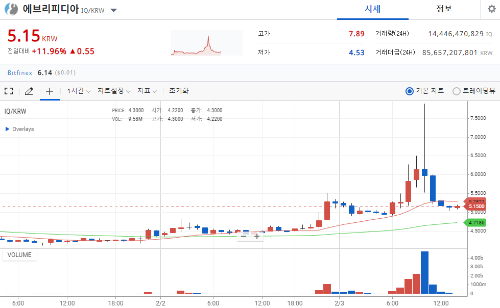 먼저 에브리피디아 차트입니다. 제가 차트를 처음 봤을 때가 급등했다가 떨어지는 시점이었는데요. 이 지점을 상향 돌파할 때 바로 사야겠다고 계획을 세웠습니다.