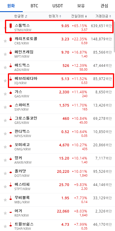 오늘은 두 개의 코인을 골랐는데요. 에브리피디아, 스톰엑스였습니다.