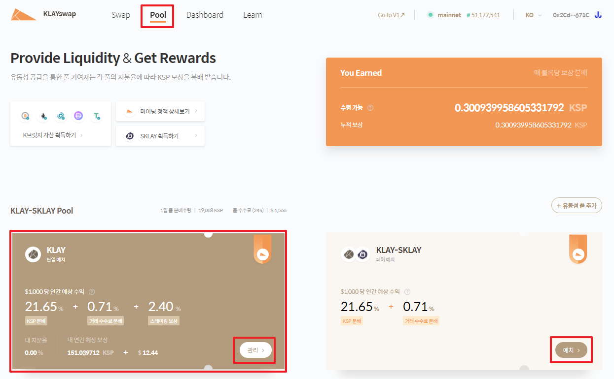 이제 "Pool"을 클릭하고, 단일 예치나 페어 예치를 고르고 "예치"를 클릭하면 됩니다. 저는 지금 'KLAY 단일 예치'에 예치가 되어 있어서, "관리"라고 되어 있는데, 예치 전이면 "예치"라고 되어 있을 겁니다.