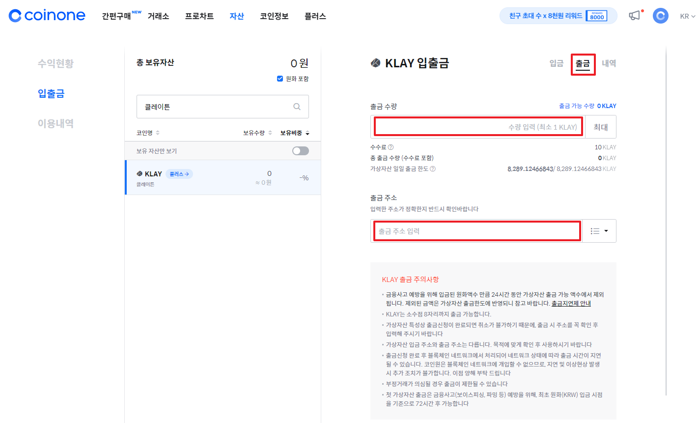 우선 코인원에 있는 클레이를 클레이스왑과 연동된 지갑으로 출금(송금)을 해야 합니다.