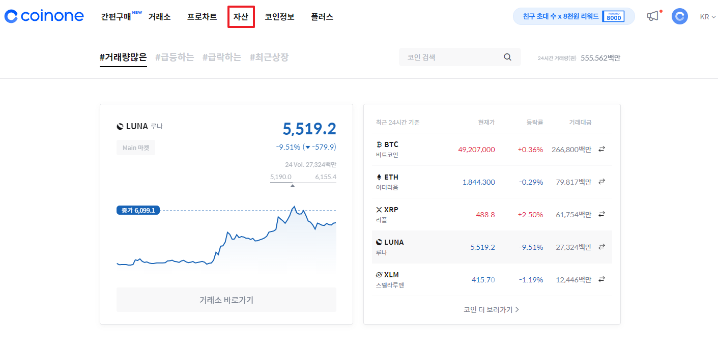 코인원 메인 화면에서 '자산'을 클릭합니다.