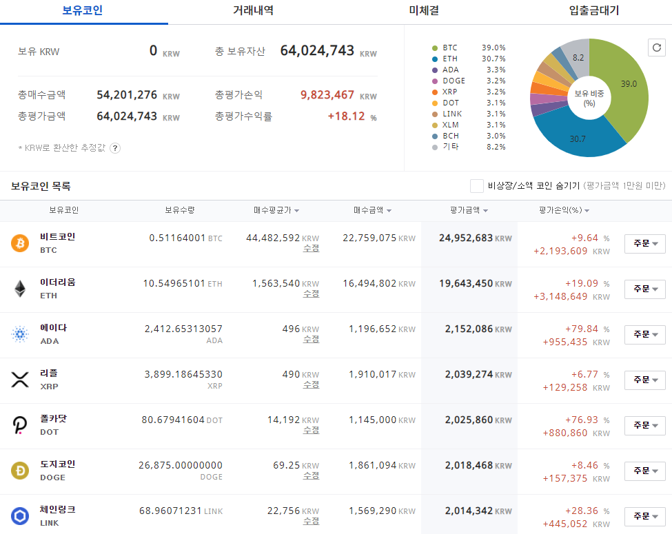 코인원에 클레이튼 2백만원을 제외하면, 투자원금 5천만원에 현재 6천4백만원입니다. 시가총액 상위 기타 코인들도 백만원에서 2백만원으로 상향 조정했습니다. 리밸런싱 직전의 포트폴리오는 별도로 정리하지 않았는데요. 시세 변동 외에는 지난 영상에서 공개해 드린 포트폴리오와 큰 차이는 없습니다.