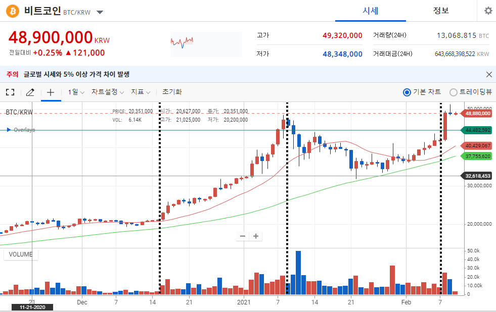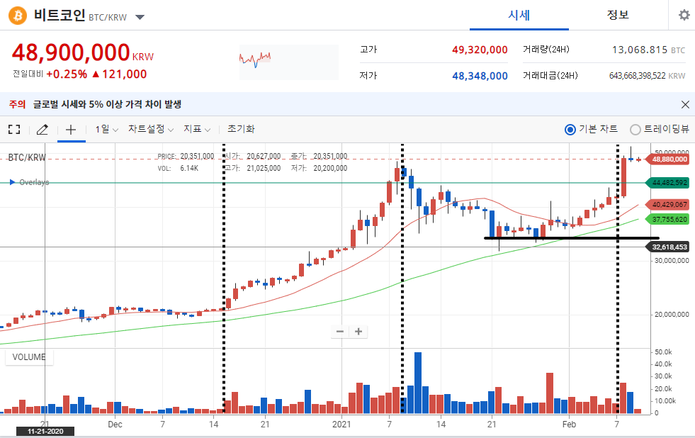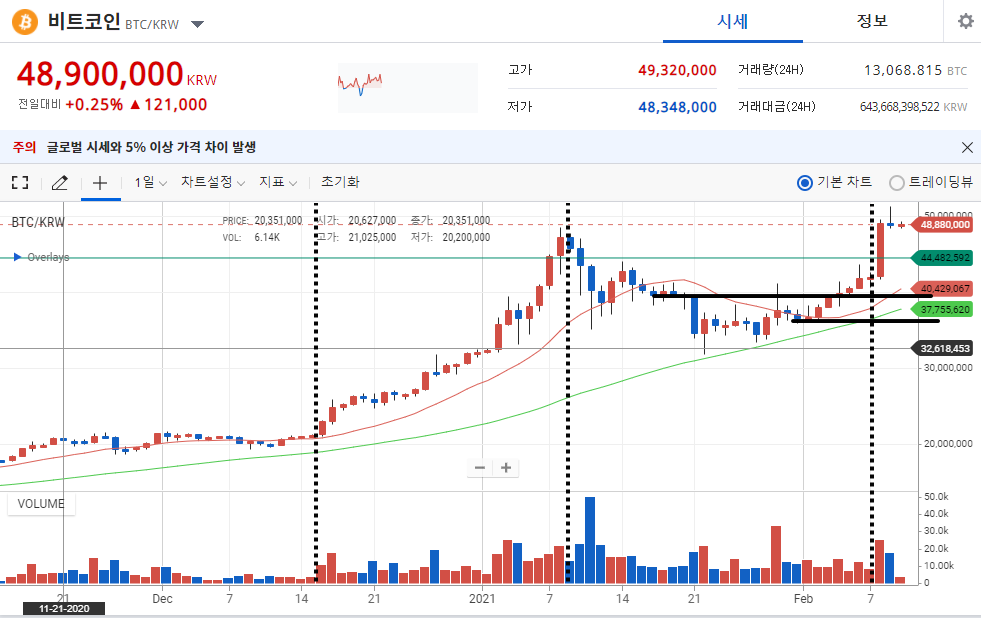 그리고 2월 8일에 전고점 4천8백55만원을 돌파했습니다. 전 이 때부터 새로운 국면이 전개되면서 한 번 더 점프할 걸로 기대하고 있습니다. 물론 신의 뜻은 바로 조정에 들어가는 걸 수도 있겠죠. 저의 희망 섞인 예상이 그렇다는 말이죠.