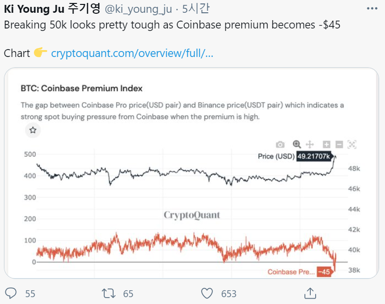 크립토퀀트는 비트코인이 5천만 달러를 돌파하기 쉽지 않을 걸로 분석하고 있습니다.