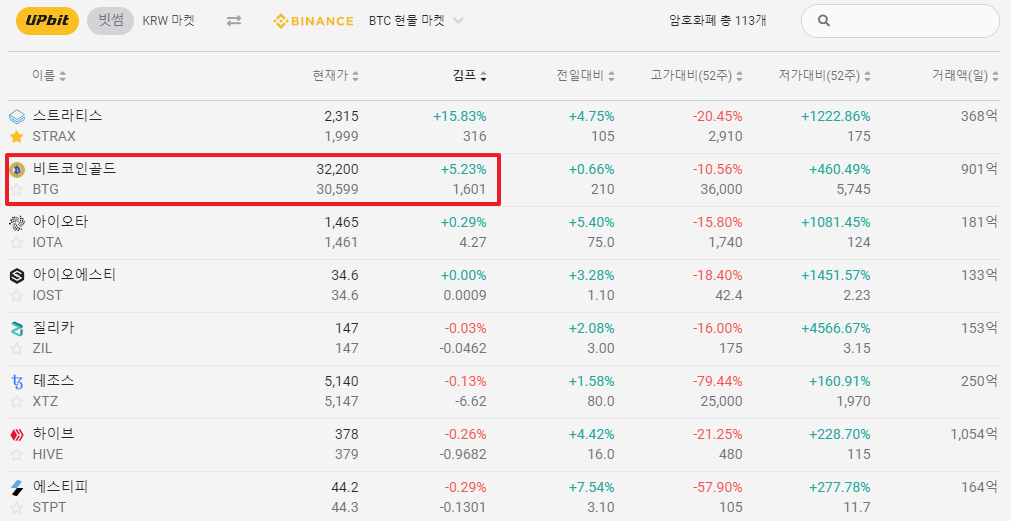 오늘 오후에 김프를 다시 한 번 조회를 해 보니, 비트코인골드가 눈에 띕니다.