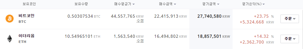 리밸런싱한 내역이 반영되면서, 매수금액과 수익율이 실제와는 조금 다른데요. 업비트 자산은 총매수금액 5천만원, 수익율 32%라고 보시면 됩니다.