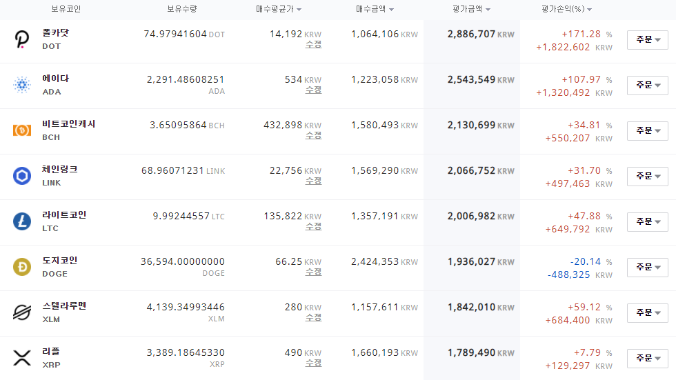그리고, 시가총액 상위 코인들은 각 2백만원으로 맞췄습니다. 이전 리밸런싱 때는 모두 백만원으로 조정을 했었는데, 추가 자금을 투입하면서 비슷한 비중을 유지하기 위해 상향 조정했습니다. 크게 상승해서 2백만원이 넘은 코인은 오히려 일부 매도를 하기도 했기 때문에 매수금액이 2백만원이 안 되는 코인이 있습니다.