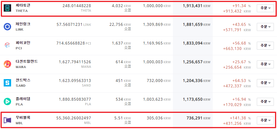 무비블록은 아튜브 덕에 반짝 상승을 기대하고 단기로 100만원 샀다가, 어제 팔고 30만원만 남겨뒀는데, 오늘 급등을 했네요. 그리고 쎄타토큰은 장기로 보고 100만원을 샀는데 아직까지는 나름 실적이 괜찮네요.