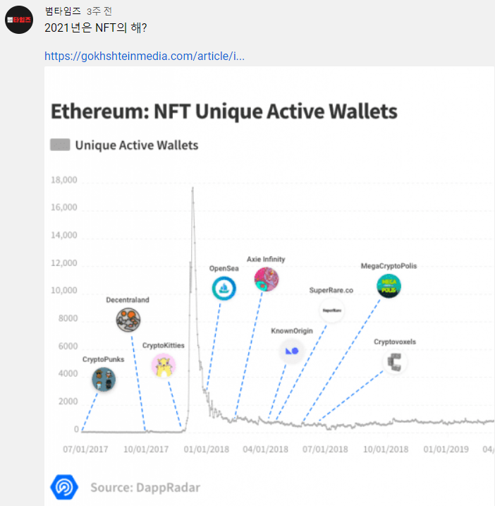 이제 제가 가장 유망하다고 생각하는 코인을 말씀 드려 볼게요. 얼마전 커뮤니티 게시글에서도 말씀 드렸듯이 NFT가 심상치 않습니다.