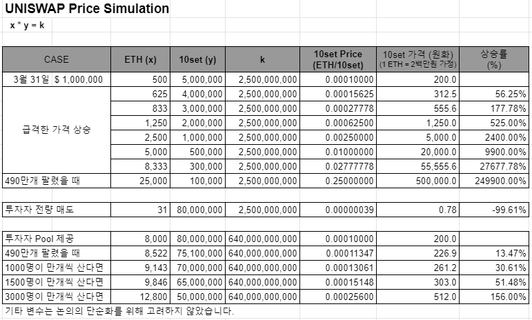 유니스왑에서 가격이 변동되는 원리를 말씀 드리고, 과연 10set은 유니스왑에 상장이 되면 폭등을 할 것인지, 아닌지 한 번 예측해 보시죠.
