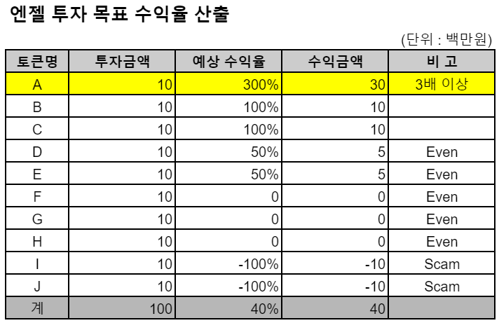 표에서도 보시듯이 시즌당 목표 수익율은 40%입니다. 두 번은 스캠으로 몽땅 날리고, 5번 정도는 평타, 두 번은 수익, 한 번은 대박을 목표로 진행할 예정입니다.