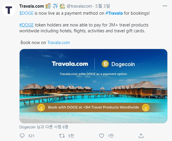 또 최근 트라발라에서도 도지코인 결제를 시작한다고 하고요.