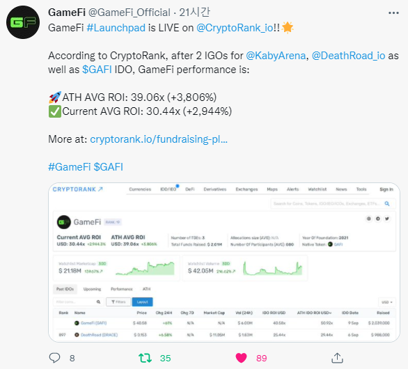 상당히 괜찮은 프로젝트라고 생각해서 우선 짧게는 소개해 드렸지만, IDO 후 뒤늦게 $26에서 매수를 한 이유는 개인적으로 여러 일들도 있었지만, 무엇보다 프리세일에서 할당 받을 수 있는 양이 제한적이거나, 할당 자체가 쉽지 않을 것 같은 생각이 들어서 그냥 좀 지켜보자라는 생각이었는데요. 역시나 완판 되었습니다. 그래도 트위터 개설(21년 7월) 2개월만에 이렇게나 급상승할 줄은 몰랐는데요.
