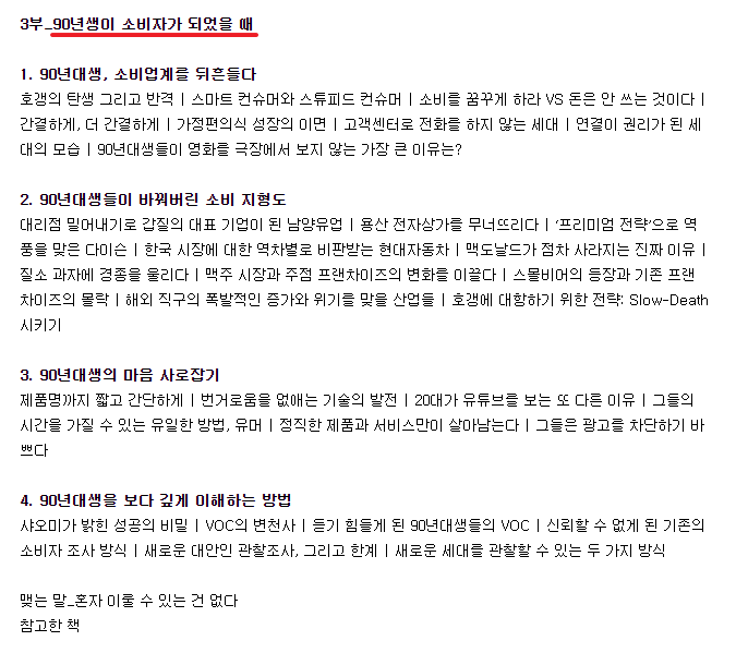 3부는 소비자로서의 90년대생의 특징입니다. 비즈니스 관점에서 참고하시면 좋은 내용인 것 같습니다. 여기선 90년대생 너희들이 갑이니까 니들 마음대로 해도 괜찮아.